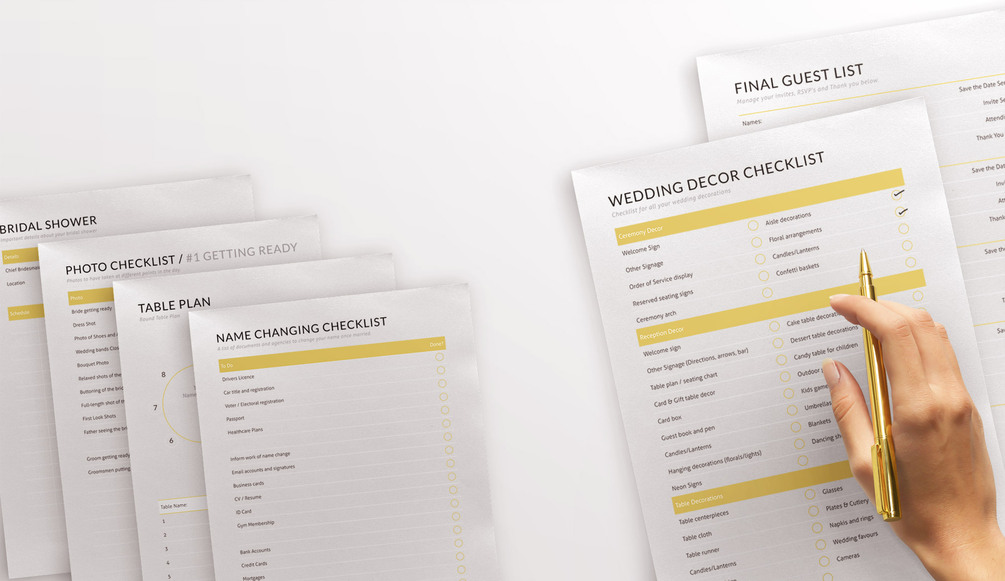 90+ Pages PDF printable full of checklists for your budget, guests, table plans, wedding venue planning and much more. We have sections for checklist including order of the day, items to take with you, things to plan and book as well as the all important to-do list.